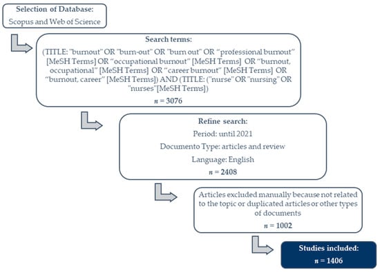 The sample included the articles of the databases up to 9 November 2021, using search terms in English combined through Boolean operators. The databases were used to retrieve the relevant publications using the following search string: (TITLE: “burnout” OR “burn-out” OR “burn out” OR “professional burnout” (MeSH Terms) OR “occupational burnout” (MeSH Terms) OR “burnout, occupational” (MeSH Terms) OR “career burnout” (MeSH Terms) OR “burnout, career” (MeSH Terms)) AND (TITLE: (“nurse” OR “nursing” OR “nurses” (MeSH Terms)). The research query conducted in the titles aimed to minimize the risk of obtaining false-positive results (irrelevant ones) [].