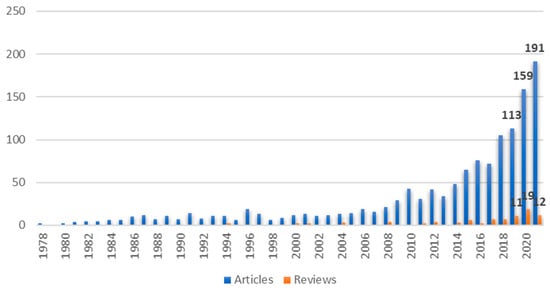 Figure 2 shows the number of articles published per year until 2021. The first publications in the databases took place in 1978. In 2021, 203 studies (191 articles and 12 re-views) were published, corresponding to the largest production in the period analyzed. The annual growth rate was 11.63%, indicating an exponential growth rate, especially in the last 3 years, with 124 papers published in 2019, 178 papers published in 2020, and 203 papers published in 2021. The number of publications per year remained below 50 publications until 2013, when there was a considerable increase in the number of publications. In 2021, the number of publications was more than double in comparison to 2017, and it was more than quadruple compared to 2012. The first review was published in 1988. The years 2020 and 2021 received the highest number of reviews: 19 and 12, respectively.