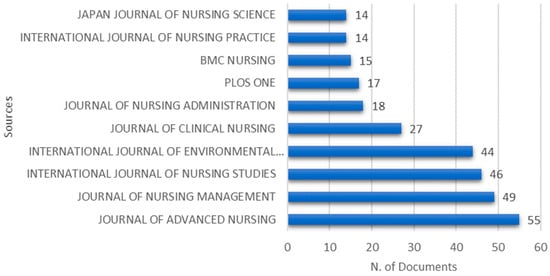 The 10 most relevant sources contributed with 21.26% of the total publications by 2021. The 10 most cited sources contributed with 41.55% of the total citations. Only six journals appeared both among the 10 most cited and among the 10 most relevant: The Journal of Advanced Nursing, the Journal of Nursing Management, the International Journal of Nursing Studies, the International Journal of Environmental Research and Public Health, the Journal of Clinical Nursing, and the Journal of Nursing Administration.