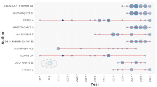 It also presents the results of the 10 most productive researchers in studies on burnout among nurses from 1978 to 2021. Authors Aiken and Sloane contributed in 2002 to the article entitled “Hospital Nurse Staffing and Patient Mortality, Nurse Burnout, and Job Dissatisfaction”, receiving the highest number of citations. Therefore, the shade of blue is darker. The result revealed that, since 1997, the authors have contributed with publications on the subject. Most researchers have contributed to the body of research in this field mainly in the last five years. In 2018 and 2017, Cañadas-De La Fuente and Gomez-Urquiza produced a total of four documents in each year and received the third highest citation count per year: 67.25. and 46.8, respectively.