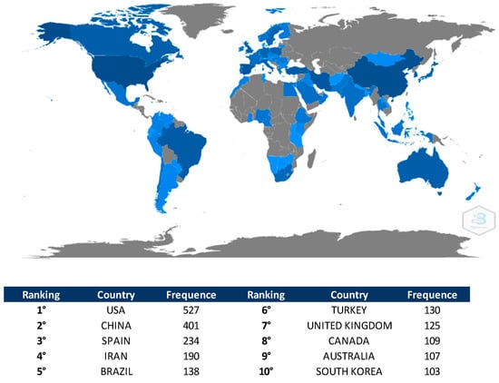 Eighty-one countries—according to all author affiliations—contributed to the development of research on the subject. These countries are geographically distributed in North America, South America, Asia, Europe, Africa, and Oceania. Figure 5 shows the scientific production by country. The map was built through “Biblioshiny”, a web interface of the bibliometrix package. Several shades of blue can indicate different productivity rates. Therefore, the darker the shade of blue, the greater the productivity. On the other hand, the gray color represents that there are no articles. The three most productive countries were the United States of America (USA) (n = 527), China (n = 401), and Spain (n = 234).