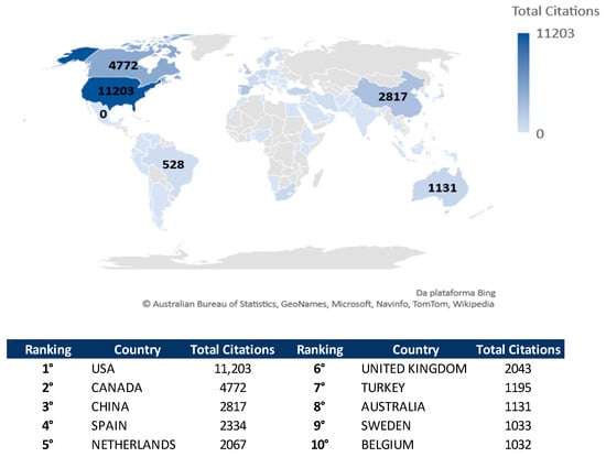 Figure 7 shows the top 10 most cited countries that contributed to the development of research on the topic. The three most cited countries were the United States of America (n = 11,203 citations), Canada (n = 4772 citations), and China (n = 2817 citations). The number of citations in the USA was more than double that in Canada, and nearly four times the total citations from China.
