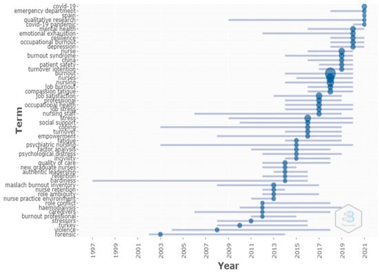 Figure 8 shows the trending topics. The size or diameter of the circle represents the frequency of the terms provided by the authors in the keywords, following the Biblioshiny parameters of five words minimum frequency and five words per year. In 2019, terms such as nurse (n = 85), burnout syndrome (n = 39), China (n = 19), patient safety (n = 18), and turnover intention (n = 17) were observed in the surveys. In 2020, it was possible to identify the following terms: mental health (n = 34), emotional exhaustion (n = 32), resilience (n = 27), occupational burnout (n = 25), and depression (n = 22). In 2021, the highlighted terms were COVID-19 (n = 30), emergency department (n = 6), Spain (n = 5), qualitative research (n = 5), and COVID-19 pandemic (n = 5). In March 2020, the World Health Organization (WHO) declared the COVID-19 pandemic []. The studies produced may reflect the impacts of this situation, considering that many health professionals work directly with patients affected by the disease. Recent studies indicate that, while facing the pandemic, some health professionals developed fatigue, exhaustion [], and psychological distress [,]. The lack of knowledge about how the pandemic can impact on the mental state of health professionals is a research gap [].