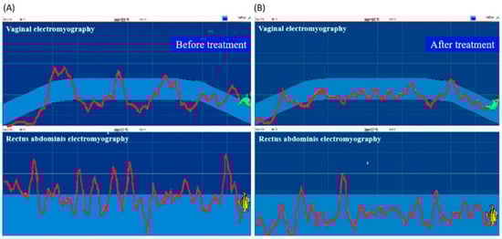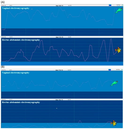 Vaginal electromyography and rectus abdominis electromyography examinations (A) before, and (B) after the rehabilitation program. (A) The rectus abdominis was inadequately induced for compensatory contraction. (B) After training, PFM contraction (measured with vaginal electromyography) was improved while the compensatory contraction of the rectus abdominis was remarkably reduced.