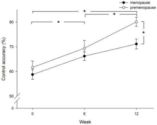 Comparison of control accuracy between patients in the pre-menopause and menopause stage at baseline (week 0), week 6, and week 12 after intervention. Significant differences are shown between menopause and pre-menopause groups (p = 0.013) and at week 12 vs. baseline (p = 0.000), week 6 vs. baseline (p = 0.036), and week 12 vs. week 6 (p = 0.002); *, p < 0.05.