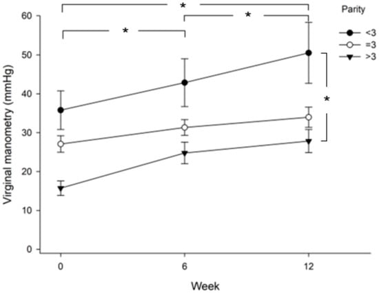 Comparison of vaginal pressure between groups of parity >3, =3, or <3. Significant differences are shown between the three groups at week 6 vs. baseline (p = 0.000), week 12 vs. baseline (p = 0.000), and week 12 vs. week 6 (p = 0.002). Vaginal pressure in the parity >3 group is significantly lower than that in the parity <3 group (least significant difference test, p = 0.003); *, p < 0.05.
