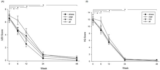 Urinary incontinence and impact on quality of life assessed with (A) the Short-form Urogenital Distress Inventory (UDI-6) and (B) the Short-form Incontinence Impact Questionnaire-7 (IIQ-7). Significant differences are shown in four groups at week 6 vs. baseline (p = 0.000), week 12 vs. baseline (p = 0.000), week 24 vs. baseline (p = 0.000), and week 48 vs. baseline (p = 0.000) in both (A,B); *, p < 0.
