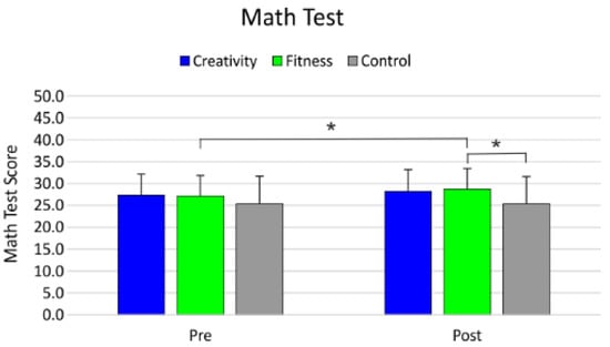 A significant main effect of group on math test (F2,123 = 3.68; p = 0.027; β = 0.66; pη2 = 0.06) was found. The Tukey post hoc test revealed that FIT had better performance than CON (p = 0.023; d = 0.597), whereas no difference emerged between CREAT and FIT and between CREAT and CON (all ps > 0.05). A significant main effect of time of assessment emerged for the math test (F1,123 = 10.82; p = 0.001; β = 0.90; pη2 = 0.08). The post hoc test revealed larger scores in the post intervention assessment (pre: 26.6, post: 27.3; p < 0.001; d = 0.155). A significant group by time interaction was observed for the math test (F2,123 = 5.40; p = 0.005; β = 0.83; pη2 = 0.08), and the Tukey post hoc test showed that FIT improved its performance in the math test after the intervention (FIT pre: 27.1; FIT post: 28.8; p < 0.001; d = 0.344), with better performance than CON (FIT post: 28.8; CON post: 25.3; p = 0.011; d = 0.621) (Figure 1, Table 2).