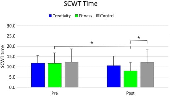 As regards the SCWT time, the factorial ANOVA revealed a significant effect of group (F2,123 = 3.12; p = 0.047; β = 0.59; pη2 = 0.048), with FIT being faster than CON (9.83 vs. 12.23; p = 0.034; d = 0.428). No difference in the SCWT time was observed between FIT and CREAT (9.83 vs. 11.00; p = 0.48) and between CREAT and CON (p = 0.45). In addition, a significant main effect of time of assessment was observed (F1,123 = 18.83; p < 0.001; β = 0.99; pη2 = 0.13), with the post-intervention assessment showing faster execution (pre: 11.8) than the pre-intervention assessment (post: 10.2; p < 0.001). The factorial ANOVA also revealed a significant group by time interaction (F2,123 = 10.47; p < 0.001; β = 0.98; pη2 = 0.14). The post hoc analysis revealed an enhanced performance in the FIT in the post-intervention assessment compared to the pre-intervention assessment (pre: 11.6; post: 8.1; p < 0.001; d = 0.764). FIT showed faster performance in the post-intervention assessment than CON (FIT: 8.1; CON: 12.1; p = 0.002; d = 0.787) (Figure 2, Table 3).
