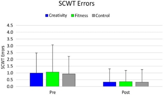 The factorial ANOVA showed a main effect of time of assessment for the SCWT errors (F1,123 = 17.27; p <0.001; β = 0.98; pη2 = 0.12), with the post-intervention assessment showing more accurate performance than the pre-intervention assessment (pre: 0.99; post: 0.34; p < 0.001; d = 0.496). No significant difference amongst groups was found (Figure 3).