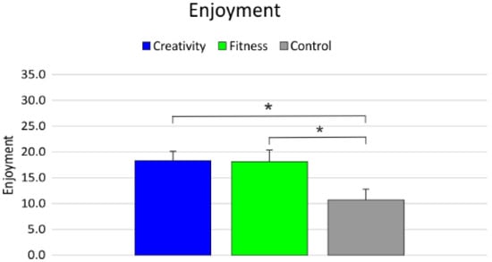 The statistical analysis on the level of enjoyment showed a significant main effect of group (F2,123 = 178.46; p < 0.001; β = 0.99; pη2 = 0.74). The post hoc analysis showed that both CREAT (18.3) and FIT (18.2) had larger enjoyment scores than CON (10.7; all p < 0.001; d = 3.83, d = 3.46, respectively, for CREAT and FIT) (Figure 4, Table 4).