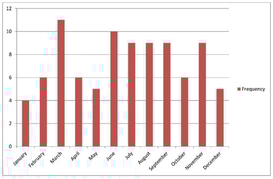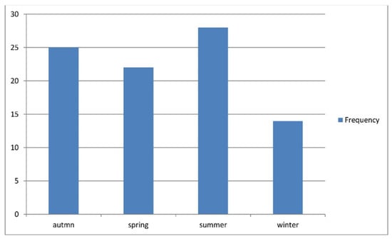 The cases in our study occurred throughout the year, but the highest incidence occurred in summer (28%), followed by autumn (25%), spring (22%), and winter (14%). This differs from other studies, in which winter and spring were the most common seasons. These findings may relate to the low summer temperatures in our area (22 °C–25 °C) or other reasons that require further research [1,14,16].
