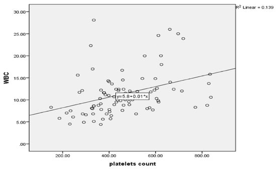 Approximately 35% of cases had a platelet count ≥ 500 × 109/L, and 8% had a platelet count above 700 × 109/L. Platelet counts ranged from 150 × 109/L to 883 × 109/L, with a mean of 461.60 × 109/L ± 154 × 109/L. Leukocytosis was found in 46% (41/89) of cases, with a positive correlation between elevated WBCs and platelets (r = 0.373, p = 0.001; Figure 5). Of the patients with renal involvement, 52.3% (11/21) had thrombocytosis and leukocytosis (OR = 2.035, 95% CI: 0.75–5.52 and OR = 1.397, 95% CI: 0.522–3.716, respectively). Mean red blood cells were 5.12 ± 5. 57 × 1012/L, mean WBCs were 11.35 ± 4.97 × 109/L, and mean hemoglobin was 13.01 ± 1.84 g/L (Table 3 and Figure 5).