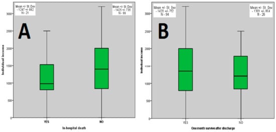 Impact of individual income on in-hospital (A) and on 1-month follow-up (B) survivability rates in patients with acute HF.