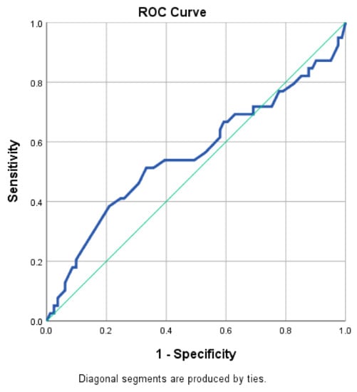As mentioned in the initial section, the 120 included patients with acute HF presented symptoms suggestive of either an acute onset de novo HF (31 cases), or an acute decompensation of a previously stable chronic HF (89 cases). We considered it interesting to evaluate the potential influence of poor economic status (expressed as a low monthly income) in the diagnosis of a newly installed acute HF. ROC analysis (Table 7) revealed that the area under the curve (Figure 2) did not exhibit diagnosis performance related to poor financial situation in discriminating between newly diagnosed HF and an exacerbation of a preexisting one (AUC: 0.557). This aspect can be explained by the similar influence exerted by the lack of adequate material means both in the decompensation of a chronic HF (e.g., due to missed doses caused by the inability to buy all prescribed medications, anemia caused by inadequate nutrition, or infections due to unheated, inappropriate housing) and the new onset of acute HF (e.g., due to SES-related risk factors such as certain deleterious dietary habits, inability to perform regular medical check-ups, etc.).