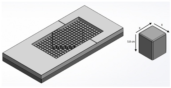 The mattress design three-dimensional drawing in Figure 1 is based on the patent measurements [18] developed using SolidworksTM 2013. The patent design has two major components, one is the main mattress that is similar to any typical mattress, design-wise, with a width of 90 cm, length of 190 cm, and depth of (14 cm), and a cavity that spans the width of 50 cm, length of 110 cm, and depth of (7 cm), as shown in Table 1. The second component of the patented design is the removal cubes that are 5 × 5 × 5.8 cm.