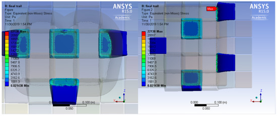 The pressure results on the model’s surface that are in contact with the mattress are inspected with ANSYSTM Maximum principle stress and Von-Mises evaluation tool; furthermore, the same tool was applied to the whole mattress and anthropometric models to evaluate the behavior and response of the whole test objects. Then, the maximum principle pressure is used to carefully adjust and redistribute the cubes to relieve the high contact pressure points on the anthropometric models.