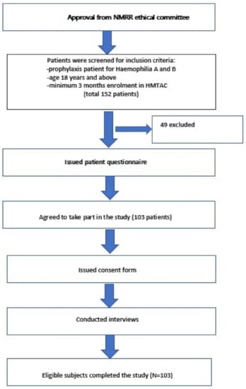 - Pharmaceutical Services Division, Ministry of Health Malaysia. Protocol Haemophilia Medication Therapy Adherence Clinic (HMTAC), 1st ed.; Pharmaceutical Services Division, Ministry of Health Malaysia: Petaling Jaya, Malaysia, 2012; p. 43. [Google Scholar]