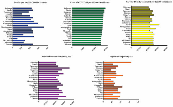Analysis of data from 20 counties in NC (Figure 1) shows no evident trend correlating the number of COVID-19 cases with the number of deaths, median household income, and poverty. Notably, Robeson county had the highest rate of cases (14,209 per 100,000 inhabitants) and the highest percentage of poverty (31.5%). Additionally, there is a negative correlation between number of cases (p < 0.05) and number of deaths (p < 0.01) with both income and vaccination (Table 2), showing that the lower the median household income and vaccination status, the higher the number of COVID-19 cases and deaths. Moreover, there is a positive association between the vaccinated population and median household income (Table 2).