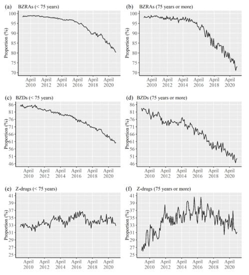 Several previous studies have investigated the actual conditions of BZRA prescriptions in Japan [1,6,7,10,11], and the actual status of the long-term use or characteristics of patients using BZRAs has been revealed. Specifically, BZRAs were shown as the most common hypnotic drugs prescribed as the first line of treatment to patients in Japan [7], and 9% of new benzodiazepine (BZD) users were given more than eight months of prescription [11]. Additionally, long-term BZD drug prescription occurred more frequently in older patients [6], and the psychiatrist-prescriber was found to be a predictor of long-term BZD use [10]. However, only one study has investigated the prescription trends of BZRAs during the previous decade [1]. A previous study showed the prescription trend from 2012 to 2017 and indicated that proportions of patients prescribed ≥3 BZRAs did not decrease during the analyzed periods in Japan [1]. However, a medical fee reduction is not applied even if one BZRA is prescribed as an anxiolytic and two BZRAs are prescribed as hypnotics, and it might not be surprising that the proportion of patients prescribed ≥3 BZRAs has not decreased over the years. In addition, previous studies in Japan did not investigate the trends in the proportion of patients prescribed BZRAs among those prescribed anxiolytics or hypnotics in recent years. If other types of anxiolytics or hypnotics were more actively prescribed in recent years, it is possible that the proportions were reduced over the years. Moreover, to our knowledge, the prescription trends after 2018 have not been investigated in previous studies, and an effect of the recent medical fee revision on prescriptions of BZRAs has not been revealed. Furthermore, the long-term prescription trend of BZRAs for patients aged ≥75 years in Japan is unknown. The adverse effects of BZRAs are known to particularly occur in the elderly [3,4,5], and as per major guidelines, prescriptions for elderly persons (patients aged ≥75 years) should be made carefully [8,9]. Therefore, it is important to investigate the prescription trends in patients aged ≥75 years. Apart from these points, BZRAs are classified into BZDs and Z-drugs (non-benzodiazepines) [12,13,14], and the long-term prescription trends for each type of BZRA, specifically BZDs and Z-drugs, have not been investigated in previous studies. The prescription trends of these types of drugs differed depending on the types of drugs in Spain [15], where BZRAs are one of the most commonly prescribed drugs for patients in polypharmacy [16]. This may also be true for Japan.