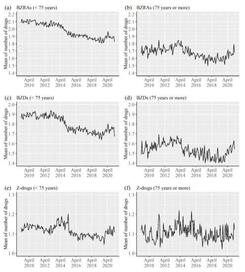 Figure 2 shows the trends of the mean of the number of types of drugs prescribed to a patient in a month as per the age group and type of drugs. A continuous decreasing trend was observed for BZRAs among patient aged <75 years. However, the mean value decreased from about 2014 in patients aged ≥75 years, while it showed an increasing trend in the previous few years. The trends for BZDs and Z-drugs were a little bit different among patients aged <75 years, while they were relatively similar among those aged ≥75 years.