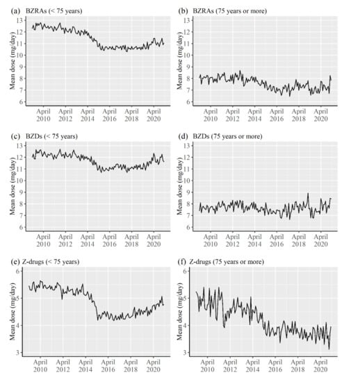 Trends of the mean of average daily doses (diazepam-equivalent mg/day) for a patient in a month by the age groups and the type of drug. (a) Mean for BZRAs in patients aged <75 years, (b) Mean for BZRAs among patients aged ≥75 years, (c) Mean for BZDs among patients aged <75 years, (d) Mean for BZDs among patients aged ≥75 years, (e) Mean for Z-drugs among patients aged <75 years, (f) Mean for BZDs among patients aged ≥75 years.