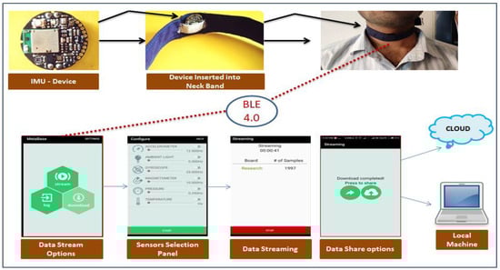 Inertial Measurement Unit (IMU) embedded in an elastic neckband captures the kinematic data required for the analysis. IMU devices are available in miniature sizes and can be used to design wearable products. For this research, Metawear CPRO, an IMU device developed at MBIENTLAB (https://mbientlab.com/metamotionc/) (accessed on 9 November 2021), has been used. It has on-chip memory, processing unit, accelerometer, gyroscope sensor, magnetometer sensor, pressure sensor, and temperature sensor. In addition to these sensors, this device has inbuilt Bluetooth support to establish communication with the associated mobile application or any Bluetooth device to transmit the device data. This IMU device can stream data for 8–24 h continuously using a 3.3 V coin-sized battery and is attached to a wearable band with an adjustable strap to fit it firmly around the neck. This neckband, when integrated with the proposed predictive analysis, can be referred to as a Smart Neckband for its context-aware functionalities. The primary use of this device is to record neck movements [28]. The technical specifications of the device and built-in sensors are given below: