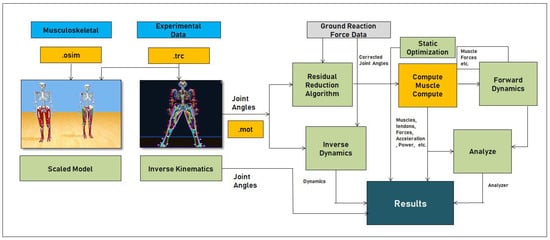 This is the most popular open-source tool used to create and study human musculoskeletal models and provides extensive data on kinematics and kinetics of human movement. Built-in functionalities such as Scale, Inverse Kinematics (IK), Inverse Dynamics (ID), Residual Reduction (RR), Static Optimization (STO), Computed Muscle Control (CMC), and Analyze provide support to extract all information related to the muscles, tendons, joints kinetics, and kinematics. An overview of the functionalities of OpenSim and the inbuilt tools is shown in Figure 2, and detailed information is made available by the OpenSim contributors [36,37,38,39].