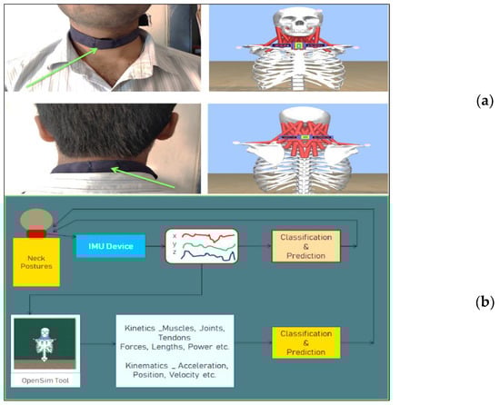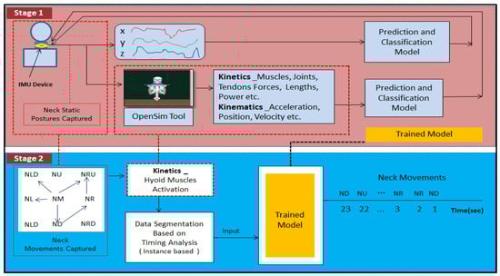 There are various conventional methods for measuring or recording human neck movements. Neck Range of Motion (N ROM) measuring instruments can be designed with proximity sensors, and NROM can be calculated with local fixed points on the human face with respect to human nose as center point. From nose to ears, the distance can be calculated, and based on degrees of freedom, the NROM values can be obtained. Similarly, there is another method, using video and biomarkers; in this method, biomarkers on the human neck and simultaneous video recording can be used to track neck movements. In continuation of these methods, our proposed model will help to find human neck movements in the digital environment [31,32,33,34,35]. In this research, an IMU-based device is used for acquiring the kinematic data of the neck, and the OpenSim simulation modeling tool is used to generate the kinetic data of the corresponding neck movements. Predictive analysis to detect neck postures from the kinetic and kinematic data is performed using machine learning methods. Validation is shown using synthetic data.