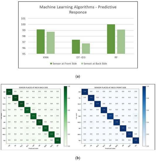 (a) Machine Learning algorithms—accuracy of the classification models; (b) confusion matrix—classification of neck posture based on sensor position; (c) performance metrics.