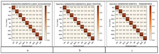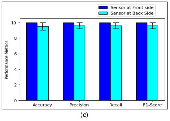 Figure 6a shows the machine-learning algorithms’ responses. Among three algorithms, the Random Forest algorithm has shown significant results in terms of classification accuracy. Further, the Random-Forest-algorithm-based confusion matrix and performance metrics were generated for the front and back location and are shown in Figure 6b,c. A total of 100% accuracy was achieved for the front-location-based classification and 99% for the back-location-based classification. From this research study, we can infer that the ideal location for the IMU device during data capture is the front side of the neck. This inference correlates with our decision to use the hyoid muscles located on the front side of the neck for the accurate classification of neck postures. In this research paper, we proposed the idea of generating kinetic data related to the hyoid muscles and using this data along with the associated kinematic data to accurately detect neck posture using classification techniques. This is presented in the following section.