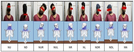 In general, the human neck has three degrees of freedom: a horizontal plane, a vertical plane, and the rolling of the head. All other asymmetric movements of the neck are variations and combinations of these three fundamental movements. At any point in time, the neck will be in one of the following nine static positions called neck postures, or it can move in any random order between these nine postures [28]. The nine static positions or neck postures are mentioned below and shown in Figure 4: