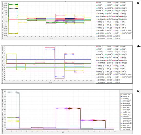 In this research, the neck musculoskeletal model developed by [40], shown in Figure 3, was used. This is a fully flexible model for head and neck movements and versatile compared to other models [41]. The neck region consists of cervical joints (C1–C7), sixty-four muscles, and various associated tendons and ligaments. The hyoid muscles play a vital role in supporting the neck movements and hence have a vital role in the proposed predictive analysis [40,42,43,44,45]. The neck musculoskeletal model used in this research integrated the hyoid muscles, and this was a big advantage for our experimental analysis. The kinetic data provided by OpenSim includes forces, length, power, and activation levels of joints, muscles, and tendons. With the neck musculoskeletal model and research insights provided by the team [40], we simulated kinetic data of the hyoid muscles for our research analysis. The hyoid muscles are Digastric, Geniohyoid, Mylohyoid, Stylohyoid, Sternohyoid, Thyrohyoid, Sterno_Thyroid, and Omohyoid, shown in green color in Figure 3.