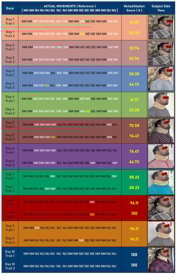 In this process, actual neck movements were recorded as NM-NM-NU-NU-NU-NU-NU-NU-NM-NM-ND-ND-ND-NM-NM-NU-NU in a timeline. As indicated in Figure 11, these movements were compared with day-wise trails. In a day, two trials were conducted, and data were compared with actual movements. Based on these movements, rehabilitation scoring can be calculated. In Table 4, the rehabilitation monitoring and assessment report is summarized. Day-wise improvements are mentioned in Table 4. This result shows the effectiveness of the proposed methodology. The scale for the assessment depends on the rehabilitation scoring system shown in Figure 12.