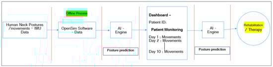 This research theme is offline-process-based, where we have to obtain IMU-based neck movement data and manually have to feed them into OpenSim software to extract the kinematics and kinetic data. These data are supplied to an AI engine; it predicts the postures/movements. Based on movements observations, the physiotherapist can analyze the patient’s condition. In terms of automation, these movement data feed to the AI engine, which can predict the posture/ movements changes and generate the assessment status. Based on this report, physiotherapists can analyze the patient’s condition and give appropriate treatment or therapy. Based on technology limitations, we have performed the entire research using an offline process. Based on advancements, we can fulfill Obj. 2 in the future.