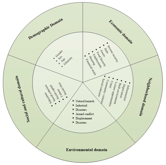 In the demographic domain, the specific demographic characteristics (such as gender, age, ethnicity, and life expectancy) of populations convey risk for, or protection from, mental illness [24]. The economic domain contains factors related to the production, consumption, and transfer of wealth that convey risk for, or protection from, mental illness, such as income, debt, assets, food security, employment status, housing, income inequality, macroeconomic trends, and subjective financial strain. The neighborhood domain constitutes constellations of environmental risk factors, such as safety, deprivation at the neighborhood level, access to recreational facilities, and availability of services. The effects of the neighborhood risk factors still remain even after controlling for individual socioeconomic deprivation and other exposures, whereas these factors frequently interact with coexisting individual factors [25]. Environmental events are defined as serious disruptions of the functioning of a community that exceed its ability to cope by use of its own resources and convey risk for mental illness [13]. The risk factors for mental disorders in the context of environmental events can be summarized on the basis of previous studies, such as a higher level of exposure to the event, previous disability experience, low socioeconomic status, insecurity, and violence [26,27,28]. In terms of the social and cultural domain, it encompasses education, family and peer relationships, social capital, social networks, culture, and group membership. These factors affect individual mental health via the pathway potentially acting on cognitive reserve, self-efficacy, social skills, social capital, social support, and trust [29,30,31].