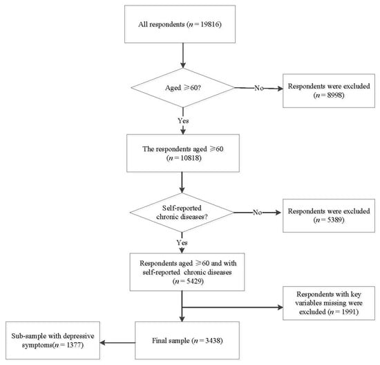 In this study, a total of 5429 respondents aged over 60 years old and with self-reported CDs were included. After excluding respondents with missing key variables, 3438 were left for data analysis. Additionally, a subsample of 1377 respondents with depression were selected from a final sample to analyze the associations of multidomain social determinants with degrees of depression. More details can be found in Figure 2.