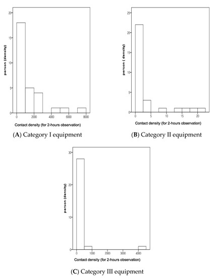 The average contact frequency of HEC in two hours was the highest for the Category I equipment, accounting for 70.4% of the contacts, followed by the Category III equipment (26.6%). Each participant had HEC with the Category III equipment for public use, with an average of 92.2 times/person in two hours. The average contact duration of HEC in two hours was the highest for the Category III equipment with median of 9.6 s/contact/person, followed by the Category I equipment with median of 9.4 s/contact/person. The average of the sum of contact duration (min/person) was 22.7 in Category I, 7.6 in Category III, and 1.0 in Category II. The median contact density (frequency-duration/min/person) was 784.5 in Category I, 266.5 in Category III, and 3.1 in Category II (Table 3).