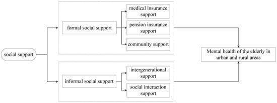 Ultimately, this study constructs a framework for analyzing the factors influencing social support on the mental health of urban and rural older adults, as detailed in Figure 1.