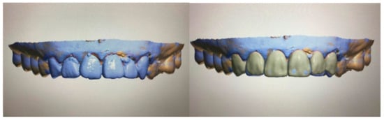 Virtual design in prosthodontics depicting tooth designing done digitally to amend slight rotation and tilting of the front teeth. The left picture shows a misaligned front dentition and the right picture shows the dentition after digital modifications. The final standard triangle language (STL) file is able to be three-dimensionally printed using specific resin via a 3D printer and can be used as a communication tool with the dental technician.