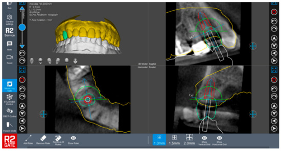 Virtual implant planning utilizing specialized software in which the dental surgeon preplans the surgical implant site using a specialized software to allow precise implant placement prior to the surgery. The figure shows a planned implant placement using R2 Gate™ (R2 Gate, Megagen, South Korea).