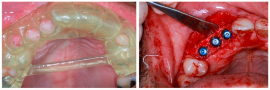 The static guided system is a computer-guided derived three-dimensional virtual implant planning that transfers the information into a pre-planned fabricated surgical template. It can be divided into two major types, which are the fully guided implant surgery utilizing full specialized osteotomy kit on guided prefabricated surgical template and partial-guided that utilizes analogue fabrication (non-computer guided) which is pilot-guided and drilling-guided [43]. Another classification of the static surgical guided is further classified into four categories; tooth-supported, mucosa-supported, bone-supported, and specialized implants or pins-supported guided template [43,44]. There is a consensus in the literature which emphasizes the fact that tooth- and mucosa-supported is not only the most stable, but also has the highest accuracy as compared to mucosa- and bone-supported. Full surgical-guided is viewed as being better than partial-guided and non-guided. On the other hand, flapless surgery is much better than flap in partial edentulous cases, whereas, flap surgery is considered a better choice in comparison to a flapless surgery in full edentulous as it has a much higher safety margin needed for full edentulous cases [45]. An example of clinical application of static surgical guide are photographed as in Figure 4.
