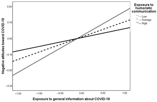 The interaction between exposure to general information and exposure to humoristic communication (EHC) on negative attitudes towards COVID-19. Note: conditional effects of exposure to general information about COVID-19 on negative attitudes are: B (unstandardized regression coefficient) = 0.15, SE (standard error) = 0.03, p < 0.001 for low EHC; B = 0.09, SE = 0.02, p < 0.001 for average EHC and B = 0.05, SE = 0.03, p = 0.06 for high EHC.