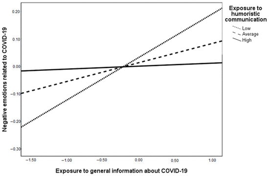 With respect to negative emotions, the exposure to general information related to COVID-19 has a marginally significant effect (β = 0.07, p = 0.05), therefore, Hypothesis 2c received marginal support, while exposure to humoristic communication has a negative, yet not significant, effect (β = −0.02, p = 0.62), rejecting Hypothesis 3c. The interaction effect between exposure to general information and the exposure to humoristic communication is significant (β = −0.09, p = 0.01), and the conditional slopes depicted in Figure 2 show that, as predicted by Hypothesis 4c, the positive relation between exposure to general information about COVID-19 and negative emotions is attenuated by exposure to humoristic communication. We can therefore conclude that Hypothesis 4c was supported.