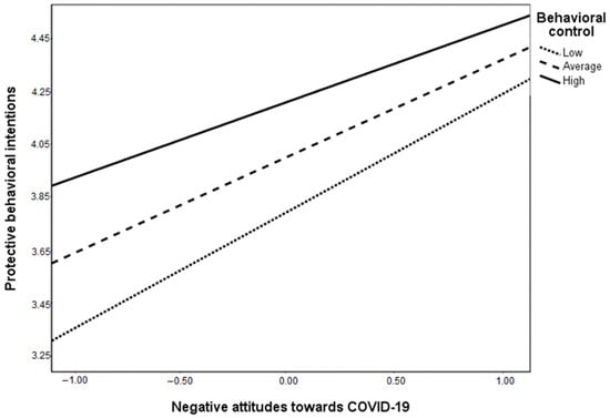 In Hypothesis 6, we expected a moderating effect of behavioral control on the relationship between negative attitudes, subjective norms and negative emotions on the one hand and the protective behavioral intentions on the other hand. The interaction effect between behavioral control and negative attitudes towards COVID-19 on protective behavioral intentions is negative and significant (β = −0.08; p = 0.02). The interaction effect is depicted in Figure 3 and, contrary to our expectations, behavioral control attenuates the positive association between negative attitudes towards COVID-19 and protective behavioral intentions. We can therefore conclude that, although the interaction effect between behavioral control and negative attitudes is significant, it is in the opposite direction than initially hypothesized, and, as such, Hypothesis 6a was not supported by the data. The interaction effect of subjective norms related to COVID-19 and behavioral control in protective behavioral intentions was not significant (β = 0.0001, p = 0.99), therefore, Hypothesis 6b was also not supported by the data. Finally, the interaction between negative emotions and behavioral control is also not significant (β = −0.04, p = 0.48), therefore, H6c is also not supported.