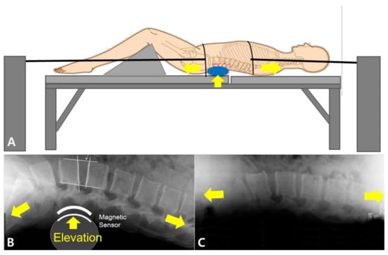 Lumbar traction techniques: (A,B), lumbar lordotic curve-controlled traction (LCCT) and (C), standard spinal traction (ST). The LCCT maintains the lordotic curve of the spine during traction by elevating the lordotic curve support.
