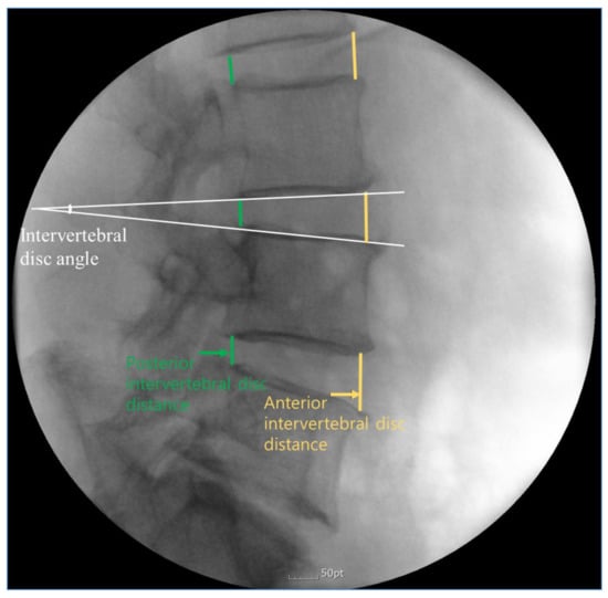 The following items were measured by one blinded specialist in radiology: intervertebral disc angle of all segments, and intervertebral disc distances of anterior and posterior side (Figure 2). Intervertebral disc distance was defined as the distance between the inferior endplate of the upper vertebra and superior endplate of the opposing lower vertebra. Intervertebral disc angle was defined as the angle between the inferior endplate of a superior vertebral body and the superior endplate of the inferior vertebral body in lateral view.