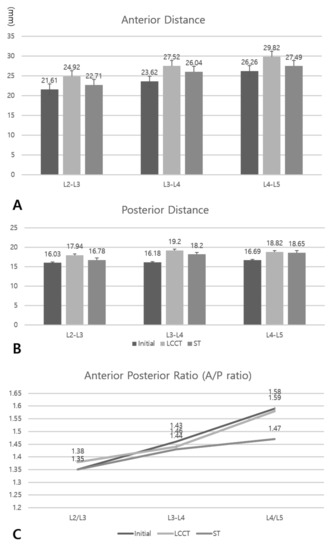 Sample size analysis showed that for a two-sided level of significance of 0.05 and an interclass correlation of 0.8, at least 37 participants were required [14], and thus, 40 patients were enrolled to cope with potential losses. To determine differences between mean L4/5 anterior/posterior distance ratios during initial, LCCT, and ST conditions, one-way analysis of variance (ANOVA) was used. Tukey’s post hoc test was used to investigate the differences between all groups. The analysis was performed using IBM SPSS Statistics for Windows (version 22.0). All study data were normally distributed, and statistical significance was accepted for p-values < 0.05.