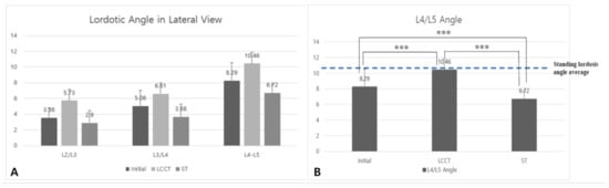 (A) The intervertebral disc angle in each vertebra. (B) In L4/5 level in three condition. Standing lordosis angle average is 10.9. Our patient in the initial group has the lowest L4/L5 angle and LCCT group has the highest L4/L5 angle. It has statistical significance among initial, LCCT, and ST (p = 0.000 ***).