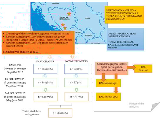 Adolescents from three counties in Bosnia and Herzegovina participated in this prospective study. The research was conducted across three testing waves, with baseline testing at the beginning (September) of the 2017/2018 school year, when participants were approximately 16 years old and were starting the third grade of high school. The first follow-up testing occurred at the end of the 2017/2018 school year (May/June 2018), while the second follow-up testing was conducted at the end of high-school education (May/June 2019), when the participants were approximately 18 years old. The sampling was done across several phases. In the first step, all high schools in selected counties were grouped into two clusters according to their size (number of students). After this, we randomly selected one-half of the schools from each cluster, and finally, one-half of the third grades from the chosen schools. Considering that some high school programs last three years, in our study, we included only classes participating in four-year high school programs. A total of 856 participants were tested at the study baseline, but the final analysis included 766 participants (347 females) who carried out the testing on all three occasions (the drop-out rate was 15%). The sample used in this study met the theoretical required sample for the observed population in studied counties (341 required participants for a theoretical sample of approximately 3000 adolescents aged 16 years, and a level of significance of p < 0.05) (Figure 1).
